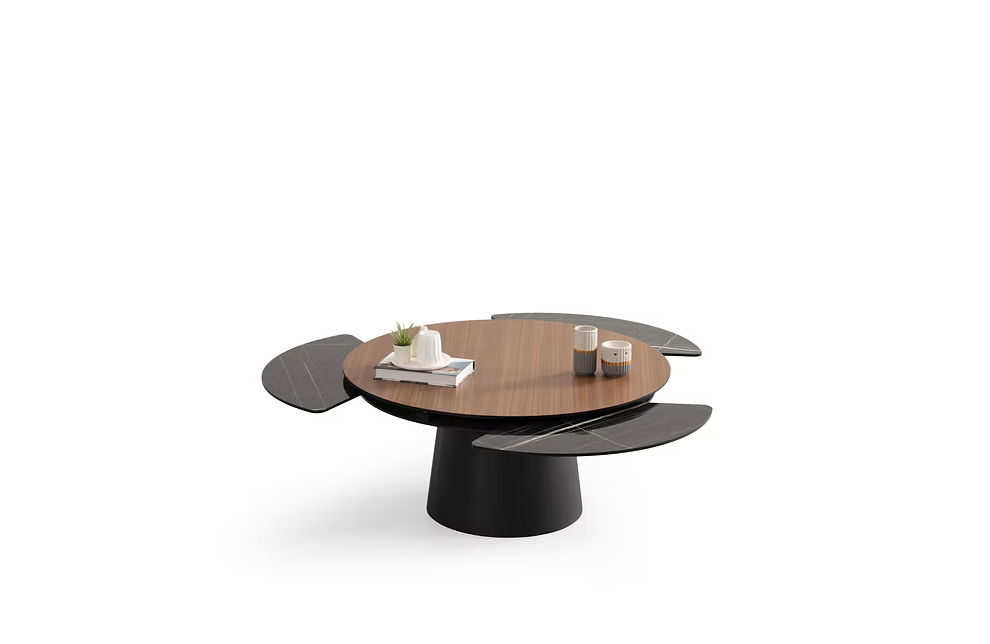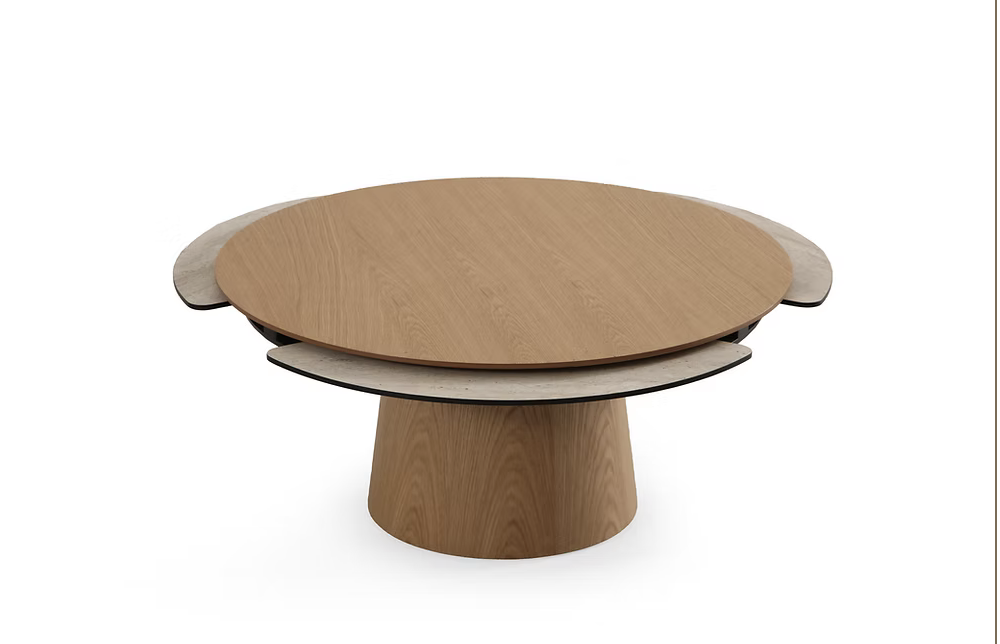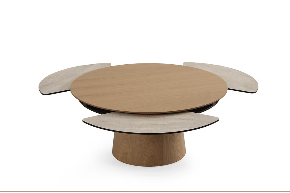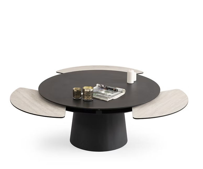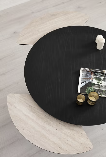 Moderne et sculpturale, la table basse Sense  joue sur les contrastes entre matières et formes. Son plateau circulaire est rehaussé de deux extensions latérales en finition bois clair, créant un effet d’aile aérien et sophistiqué. Son pied central arrondi assure un parfait équilibre entre robustesse et légèreté visuelle. Une table audacieuse, pensée pour les intérieurs contemporains qui aiment allier design fonctionnel et esthétique épurée.