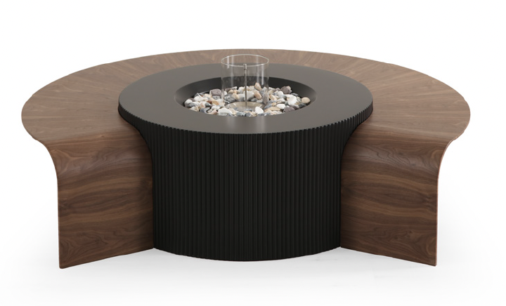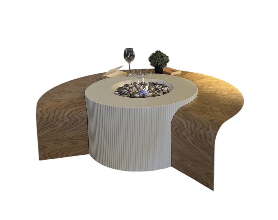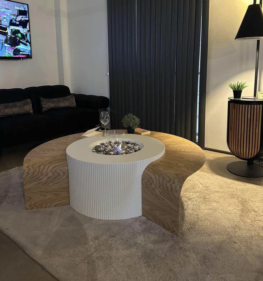 Avec son design original et sculptural, il sert à la fois de table basse et de cheminée décorative. Son centre en verre avec des galets décoratifs protège la flamme tout en apportant une touche de raffinement.