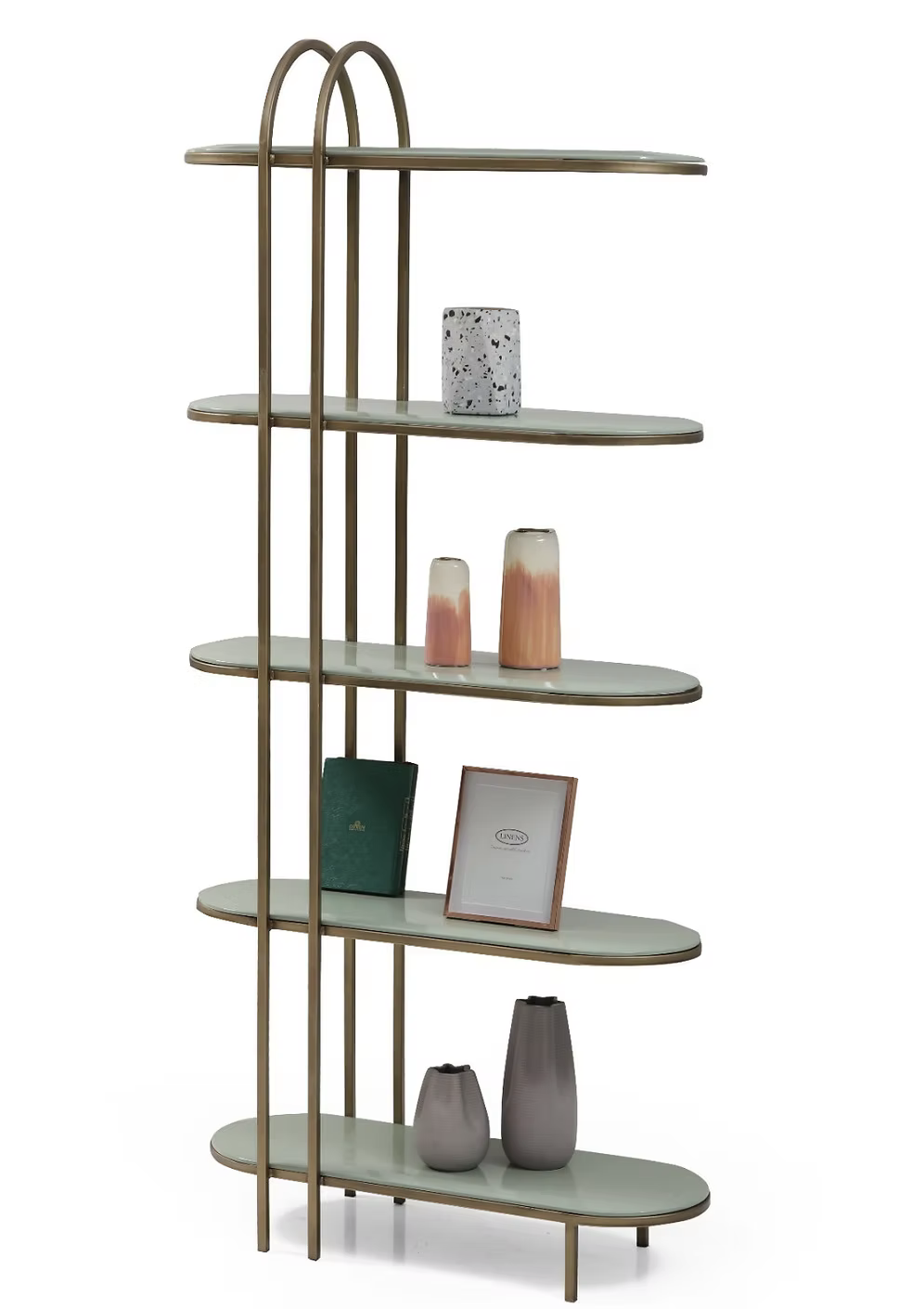 L’étagère Lola se distingue par son design aérien et raffiné. Sa structure fine en laiton doré soutient cinq plateaux en finition vert menthe douce, apportant une touche rétro chic à n’importe quelle pièce de la maison. Avec ses 180 cm de hauteur, elle offre un espace de rangement vertical optimisé sans alourdir l’espace. Son style épuré et graphique en fait un support idéal pour exposer objets déco, cadres, livres ou plantes dans un salon, une entrée ou un bureau. Alliant élégance contemporaine et fonctionnalité, le modèle Lola est parfait pour ceux qui souhaitent introduire une note de couleur subtile et de brillance discrète dans leur intérieur.