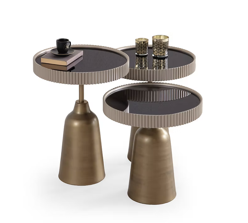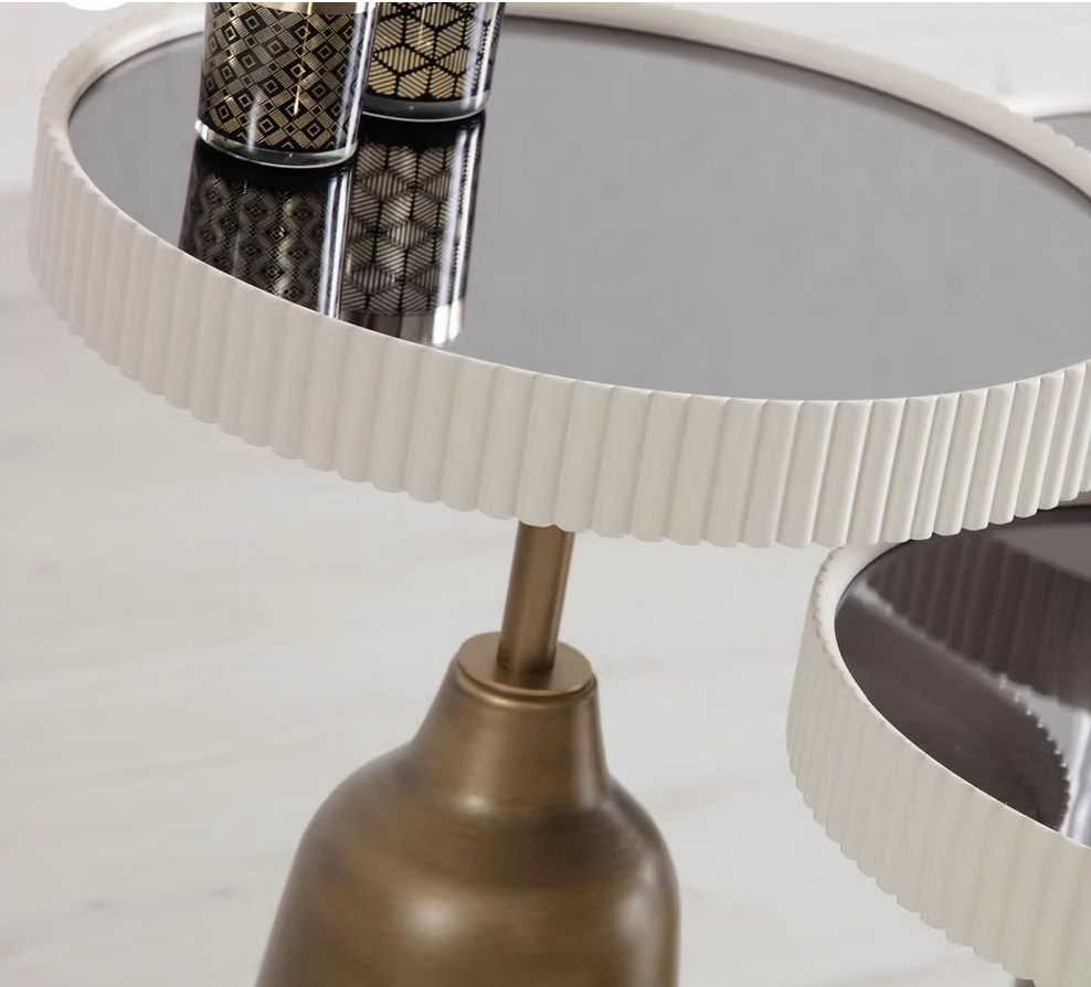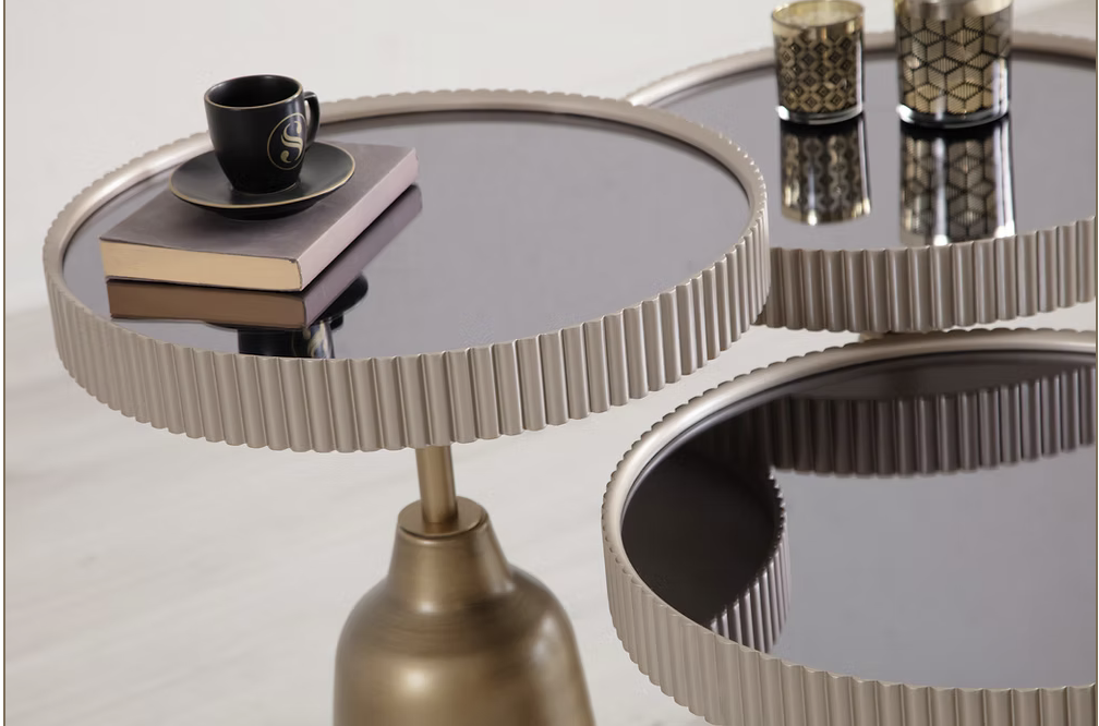 Le set Olivia est un ensemble de trois tables d’appoint aux lignes élégantes et modernes. Leurs plateaux effet strié et leurs piètements métalliques finition laiton confèrent à ces pièces un charme sophistiqué. Idéales comme tables d’appoint dans un salon ou comme support décoratif dans une chambre, elles s’utilisent ensemble ou séparément selon les besoins. Pratiques, légères et design, elles s’intègrent aussi bien dans un intérieur classique que contemporain. Un ajout unique et élégant à tout espace de vie. Le plateau de table est fait de miroir coulé, offrant une finition élégante et contemporaine. Ses pieds sont des pieds de bouteille en laiton.