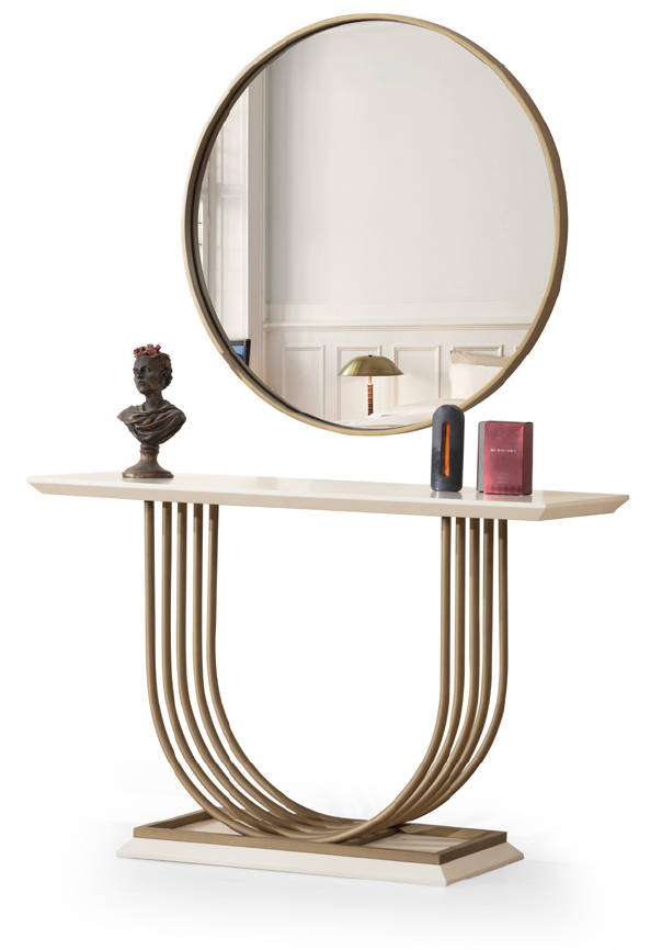 Apportez une touche d’élégance à votre intérieur avec la Console Panula, une pièce au design moderne et sculptural. Son plateau de 120 cm de large repose sur une base en laiton arquée, à la fois aérienne et graphique, qui capte la lumière et attire le regard. Son miroir (90 cm de diamètre) circulaire intégré, parfaitement équilibré avec le piétement.
