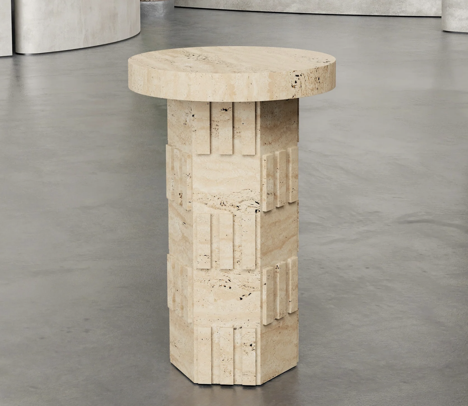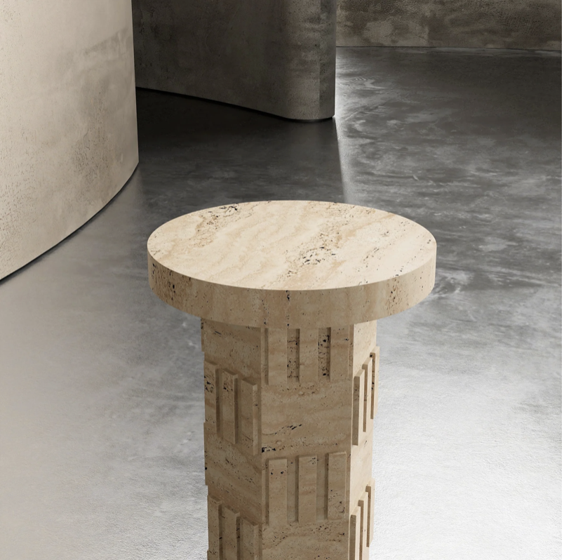 La table Pedestal se distingue par sa silhouette cylindrique imposante, enrichie de reliefs géométriques taillés dans la masse. Son esthétique minimaliste et texturée rappelle les codes du design brutaliste et des formes monumentales, tout en conservant une grande finesse visuelle grâce à la beauté organique du travertin.