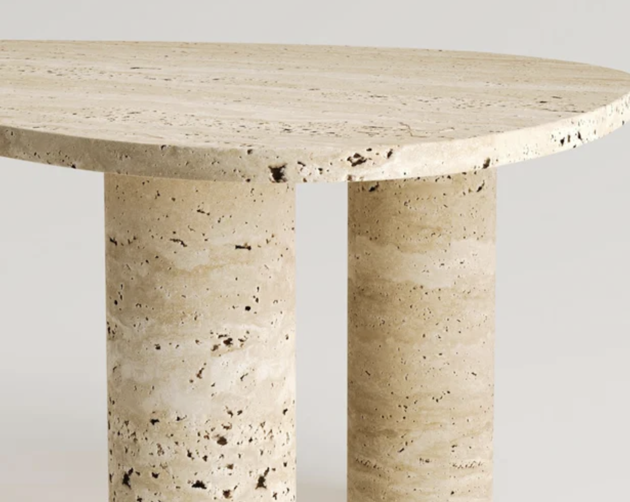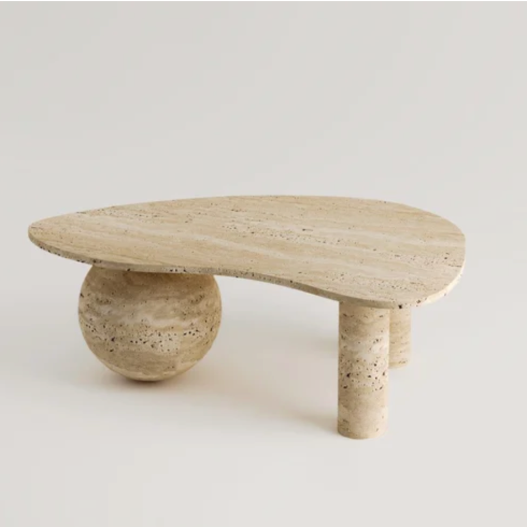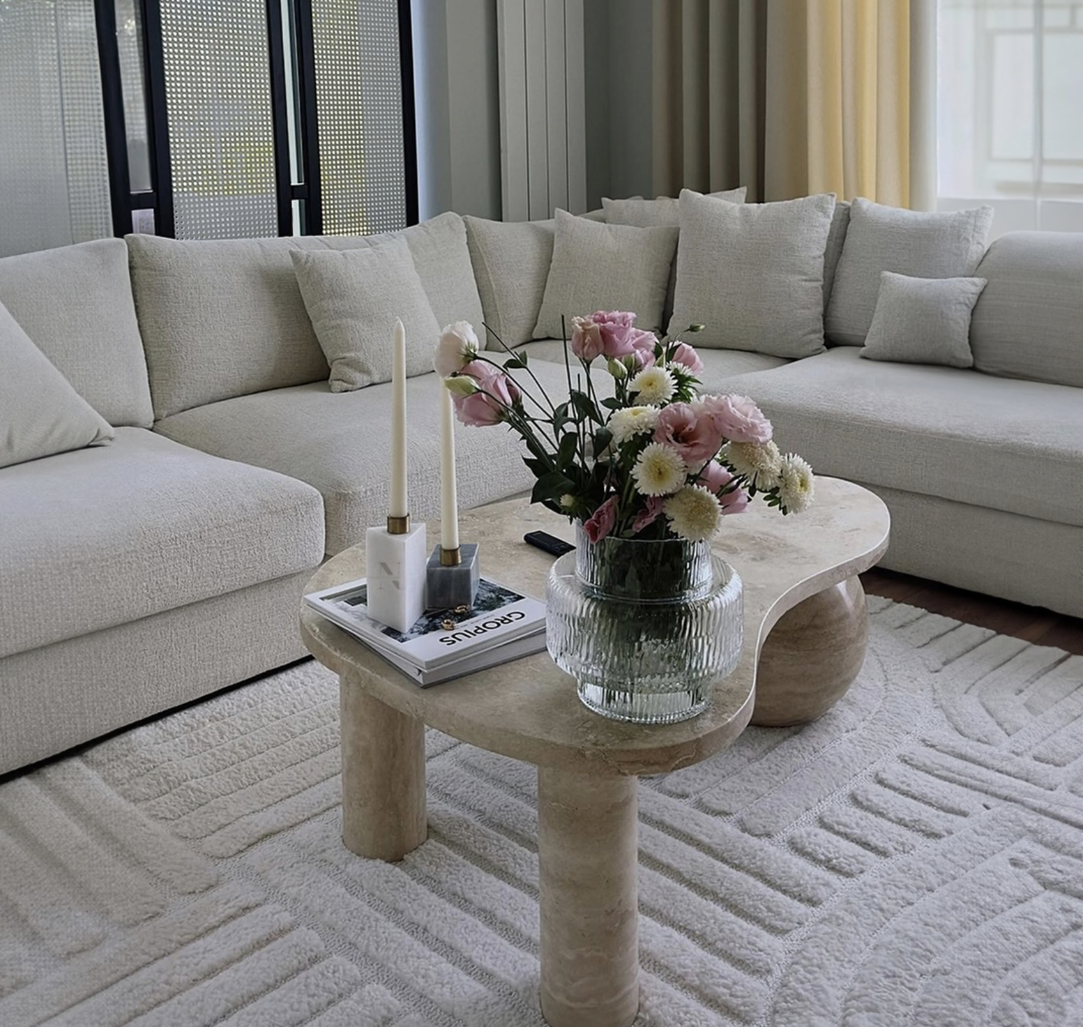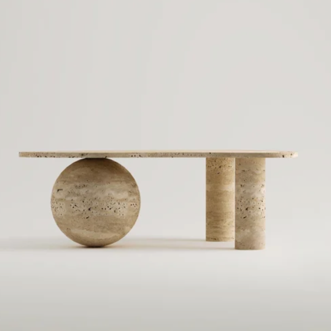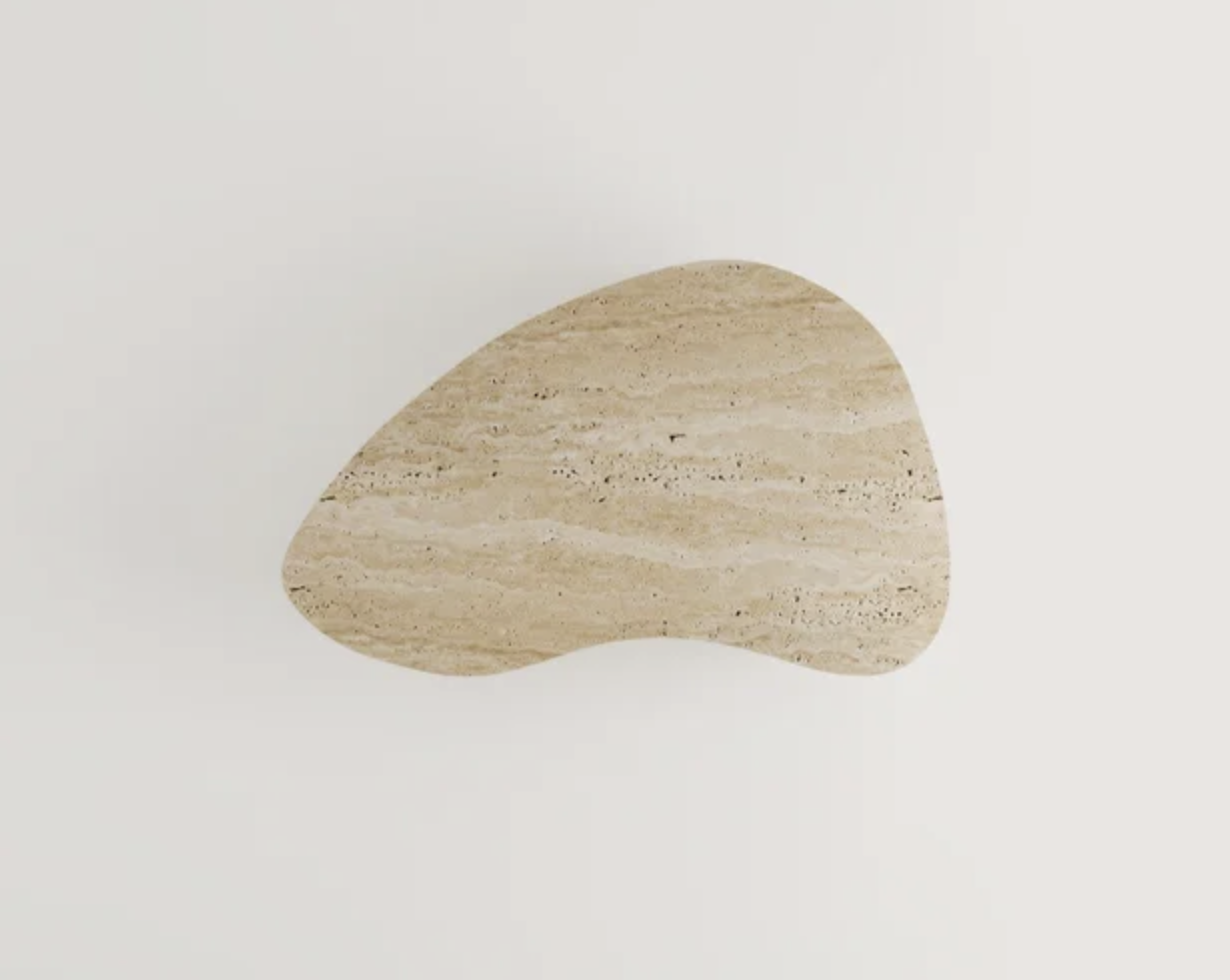 La table basse SOMA se lit comme une composition d’art contemporain au centre du salon. Entièrement façonnée en travertin naturel, elle dévoile des nuances beige sable et un veinage minéral profond, qui rendent chaque pièce unique.