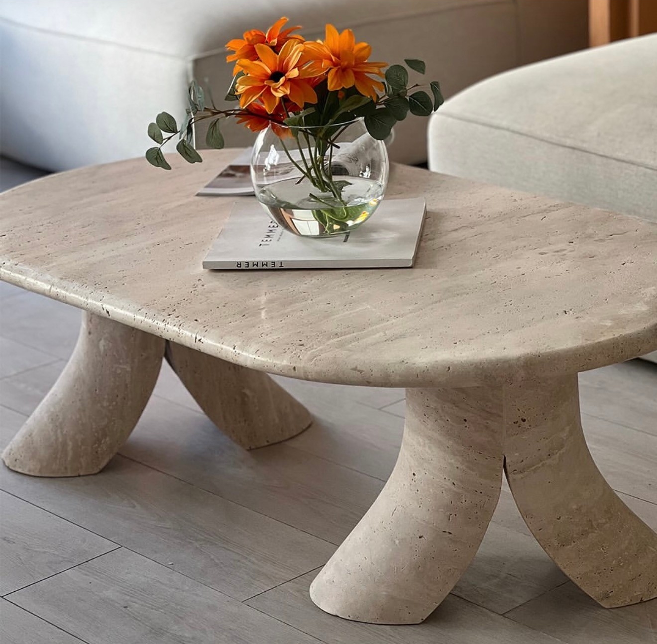 Les courbes fluides du plateau, associées à la texture des pieds cylindriques, offrent un jeu d’ombres et de lumière fascinant, apportant à la table une présence sculpturale tout en restant élégante et légère. Son design unique s’intègre à merveille dans tout intérieur moderne ou intemporel.