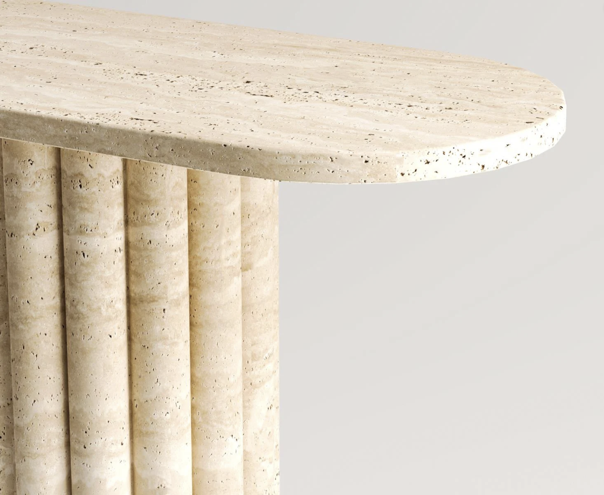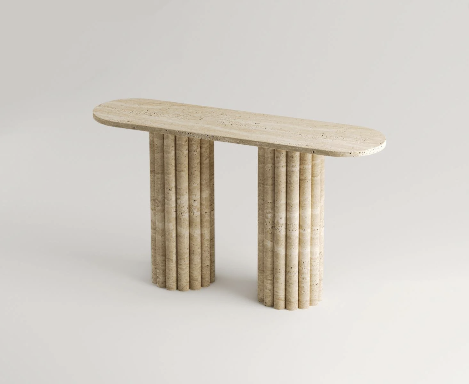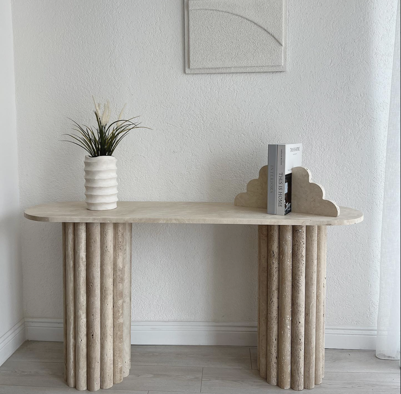 Taillée dans un travertin naturel aux tons pierre doux, traversé de fines stries et marbrures propres à chaque bloc, elle devient une véritable pièce signature dans une entrée, un salon ou un couloir. À 75 cm de hauteur, elle accueille parfaitement lampe, livres, vase ou objets d’art.